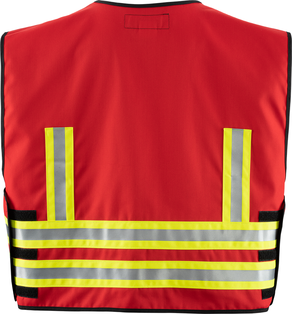 Este chaleco de mando e identificación se usa directamente sobre la chaqueta de primeros auxilios y está disponible en nueve colores. Tiene dos bolsillos para radios (lado izquierdo y derecho) así como otras características del equipo. El tamaño se puede ajustar mediante cremallera y velcro.