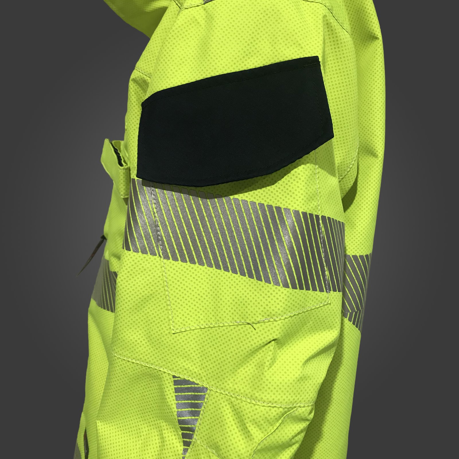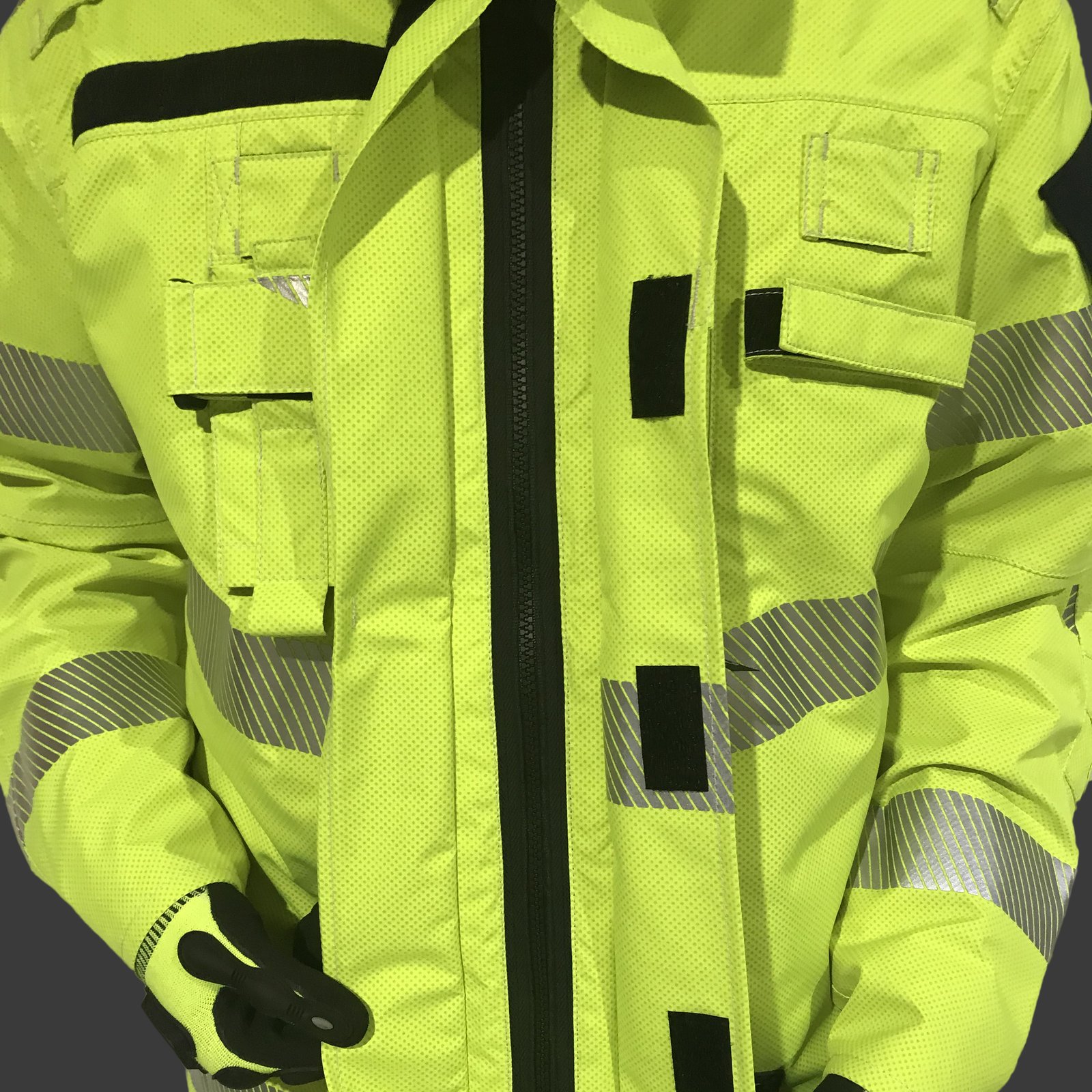 Presenta diversos bolsillos, entre ellos, bolsillo para linterna, bolsillo con cremallera en el pecho, bolsillo de radio ajustable, bolsillo en el brazo izquierdo, dos bolsillos con cremallera en los laterales del traje, bolsillos internos, identificación de rango a la altura del pecho, cierre mediante cremallera y velcro, cremallera interna para unir el forro térmico, puños ajustables, refuerzo en los codos, cuello alto y capucha extraíble.