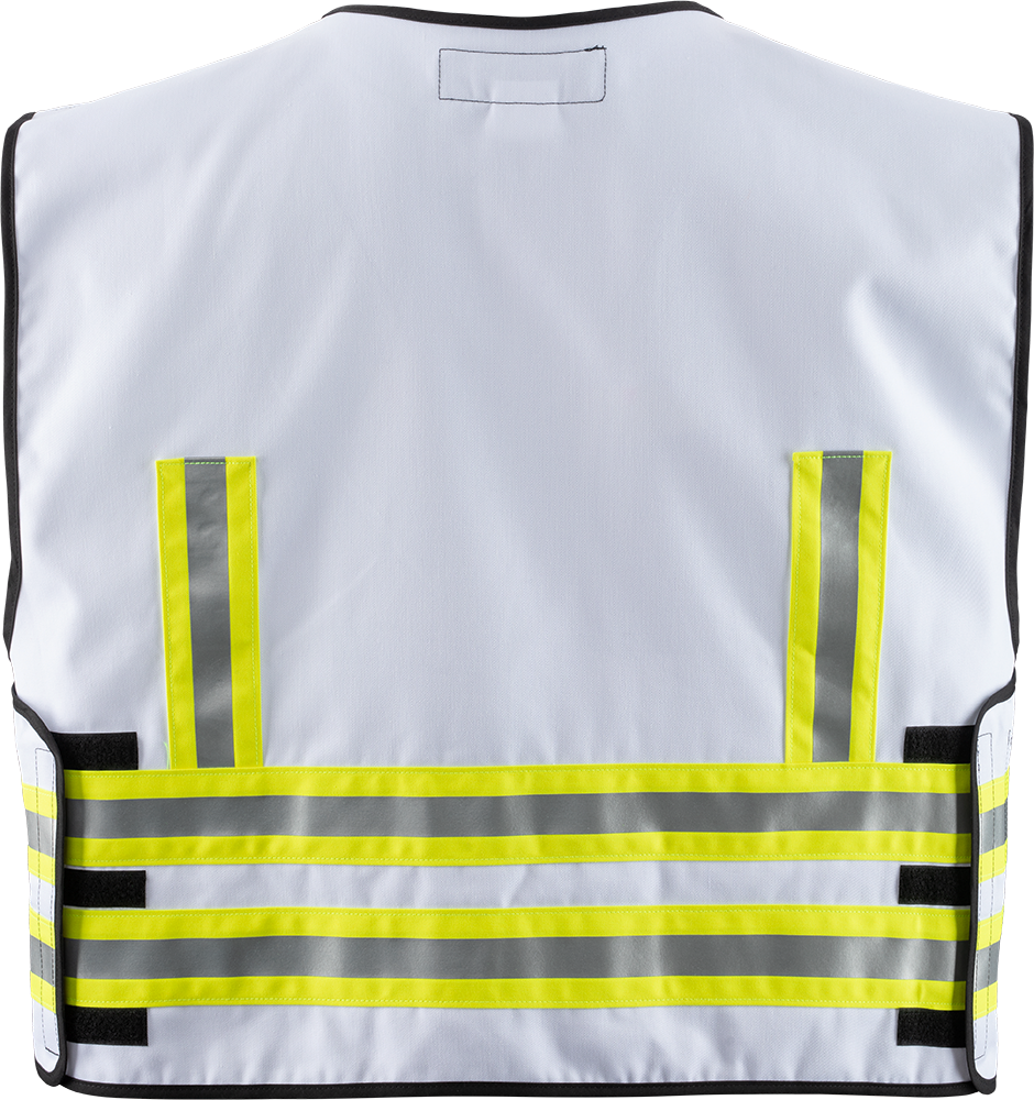 Este chaleco de mando e identificación se usa directamente sobre la chaqueta de primeros auxilios y está disponible en nueve colores. Tiene dos bolsillos para radios (lado izquierdo y derecho) así como otras características del equipo. El tamaño se puede ajustar mediante cremallera y velcro.